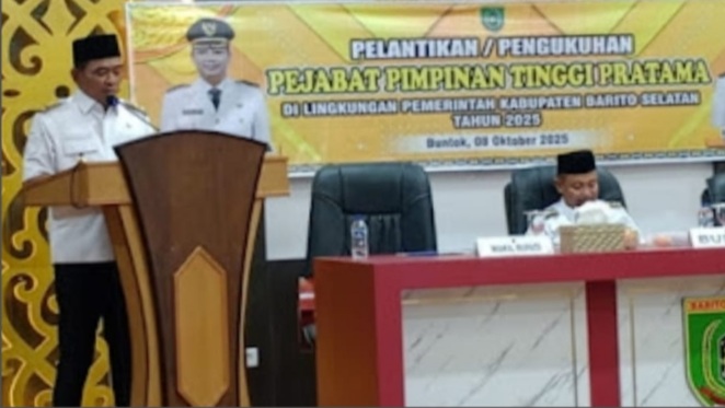Barito Selatan // Khabarmedia-news.com – Wakil Bupati Barito Selatan, Khristianto Yudha, ST., menyampaikan sambutan dan arahan penting dalam acara pelantikan serta pengukuhan 18 pejabat tinggi pratama di lingkungan Pemerintah Kabupaten Barito Selatan. Acara tersebut berlangsung khidmat di Aula Kantor Bupati Barito Selatan pada Rabu (8/10/2025).